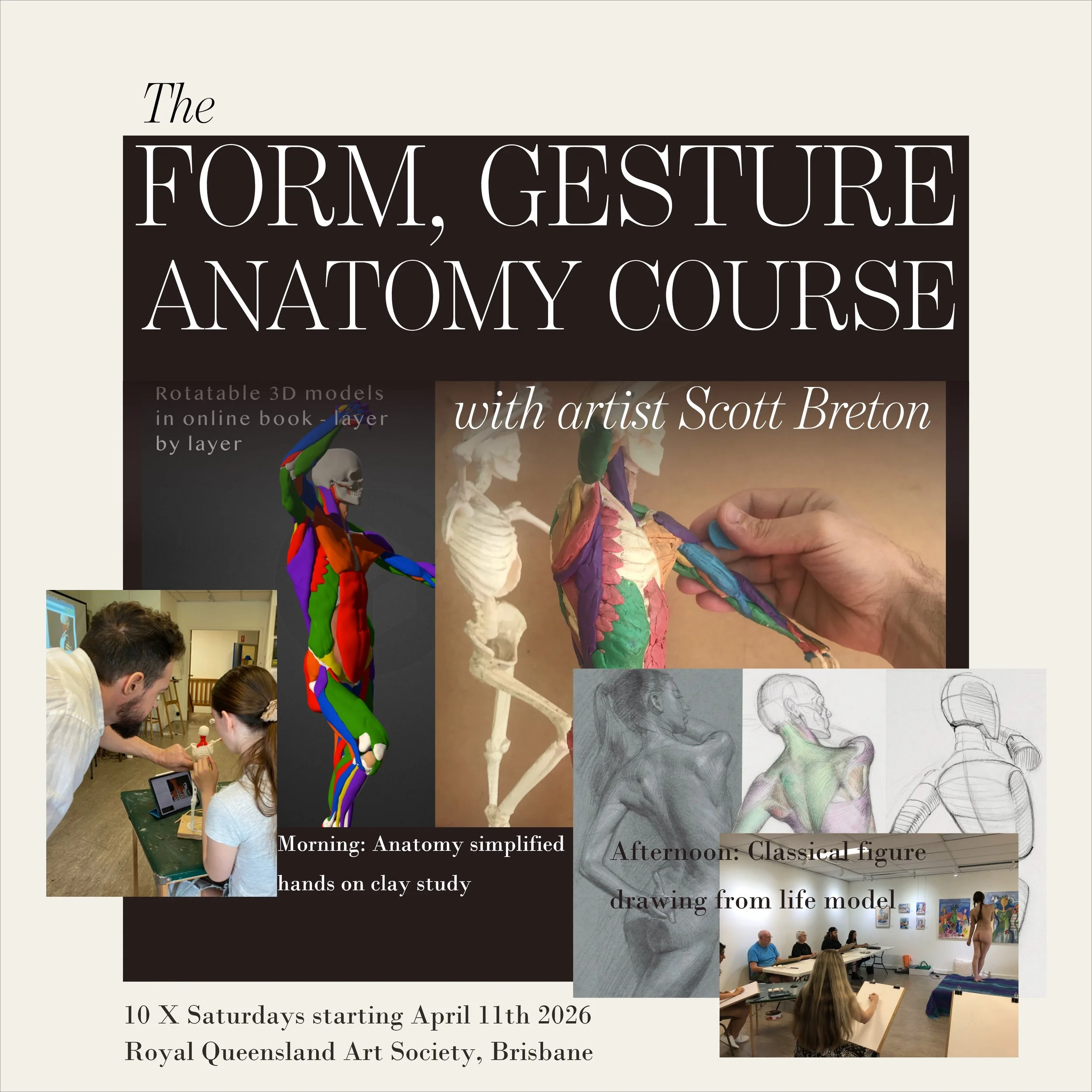 My FGA (Form, Gesture, Anatomy) course integrates artistic anatomy with classical life drawing. Starting April 11th at the Royal Queensland Art Society, Petrie Terrace, Brisbane